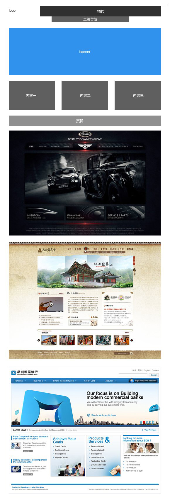 這種布局方式即是我在上面提到的常見的網站布局,不是說這種網站布局方式一無是處,但我們總不能只會這一種布局方式,次次套用吧?按照這種布局當然也可以做出來漂亮的設計,但畢竟方框限制的視線的擴展,如果客戶要求做出大氣的感覺,一般不會按照這種方式來布局,通常來講,大氣意味著開闊視野。
