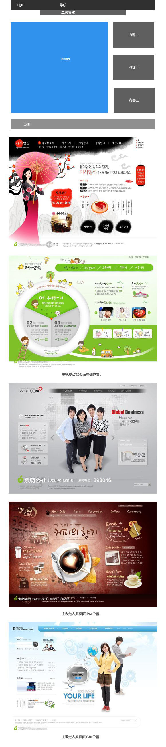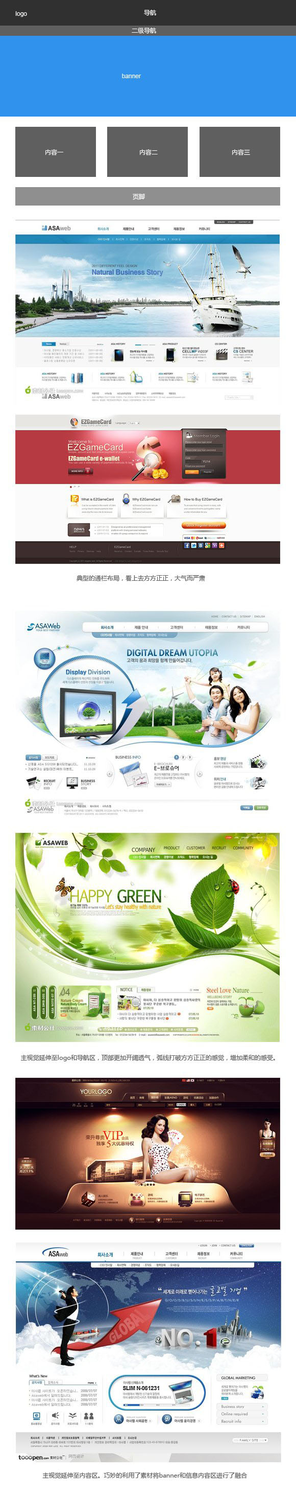 這種布局方式讓視線不再受到方框的限制,比起上面的布局方式,自然多了些大氣、開闊的味道來。另外,主視覺部分還可以靈活處理,既可以向上拓展到logo和導航的頂部位置,也可以向下拓展到內容區域,這種布局方式也是非常常見的布局方式。