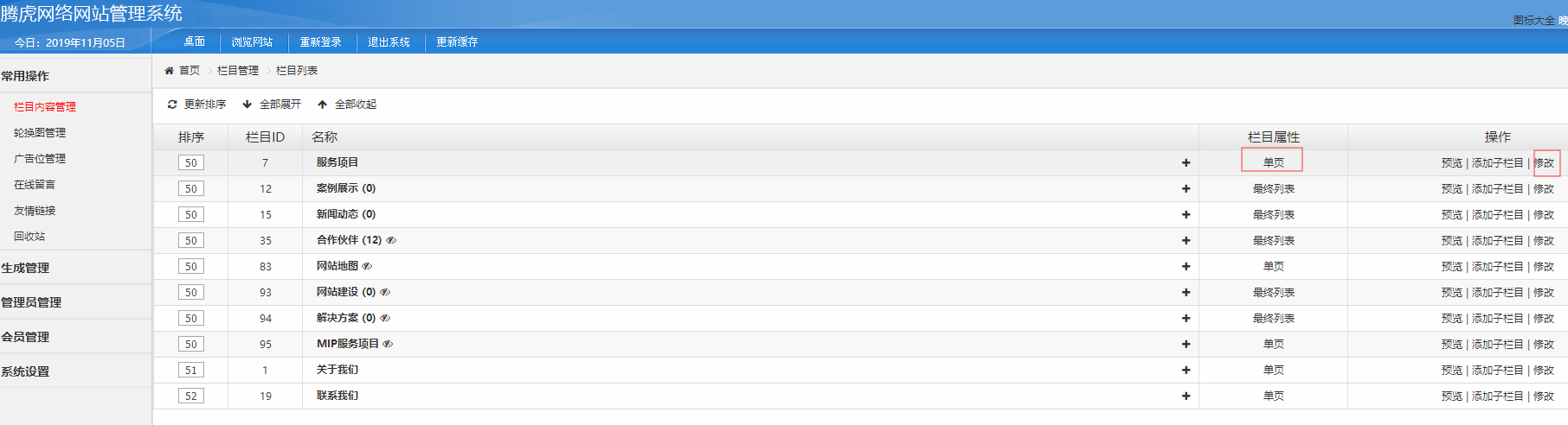 4.1 列表右側(cè)顯示是單頁(yè)的,并且點(diǎn)擊右側(cè)“+”號(hào),顯示沒有子分類的,直接點(diǎn)擊更右側(cè) “修改” 按鈕 就可對(duì)該欄目進(jìn)行添加修改(如下圖)
