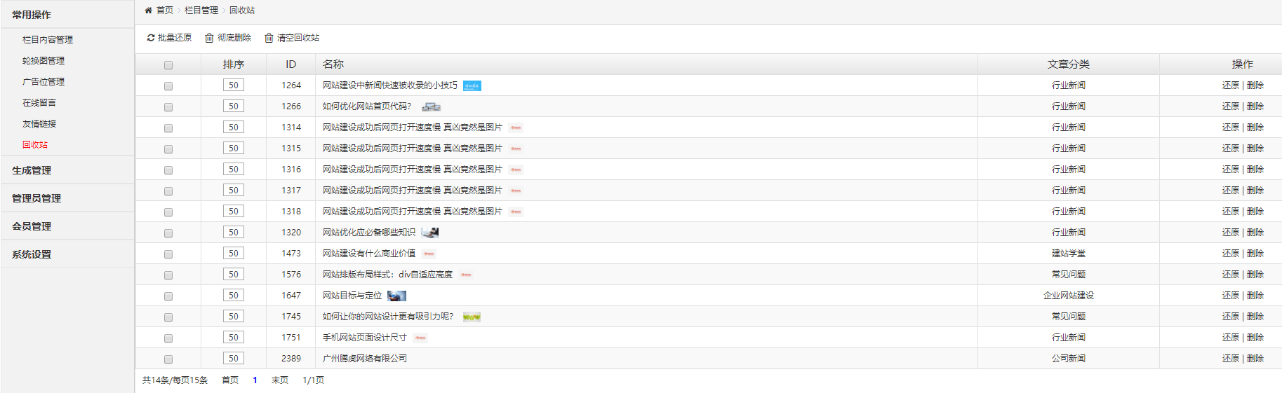 網(wǎng)站后臺(tái)刪除的產(chǎn)品新聞文檔等會(huì)先在回收站里,如果誤刪除,在回收站找到誤刪除的文檔,點(diǎn)擊“還原”就可以恢復(fù) ;點(diǎn)擊“批量還原”可以批量還原刪除的文檔;點(diǎn)擊“清空回收站”回收站就沒有文件了,也再找不回了;和電腦的回收站類似(如下圖)