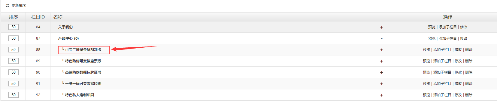 1.點(diǎn)擊“更新排序”默認(rèn)排序號(hào)碼是50;可更改數(shù)字如1、2、3后,點(diǎn)擊更新排序。顯示為1的排序會(huì)在前臺(tái)第一個(gè)顯示,其他如產(chǎn)品中心、新聞中心等欄目更改的排序操作一樣。