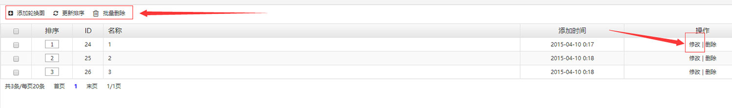 點(diǎn)擊“添加輪換圖”可添加新的輪換圖。點(diǎn)擊右側(cè)“修改”可以更換修改輪播圖。(ps.如果更換輪播圖,請(qǐng)前臺(tái)鼠標(biāo)右鍵圖片另存為 下載,這樣可以保證新替換的圖片和原有的圖片尺寸一致,或則按建議尺寸制作圖片)(如下圖)