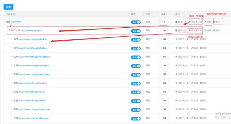 在網站后臺初始界面點擊“導航列表”,出現所有欄目的列表,然后找到“陸運”欄目,點擊右側的“添加子分類”,可在“陸運”欄目下添加二級欄目;點擊“熱門城市”右側的“添加子分類”,可在熱門城市欄目下添加三級欄目;點擊“編輯”可添加欄目名稱(如下圖)