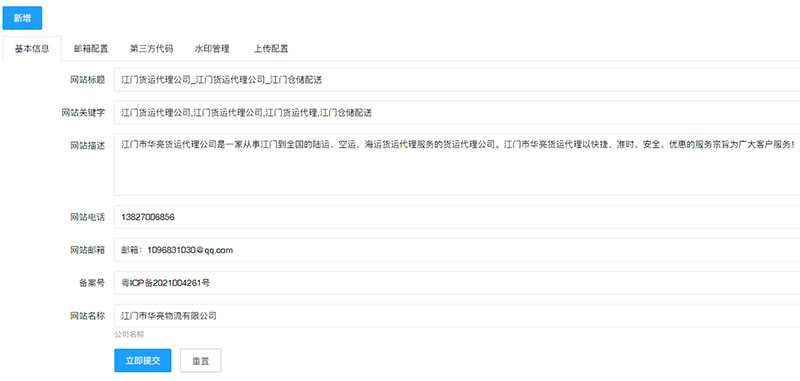 7.1 點擊 “系統設置” 里的 基本設置,可對網站標題,網站關鍵詞,網站描述等進行添加修改,添加網站標題、網站關鍵詞、網站描述有利于網站優化、收錄;點擊“新增”可增加新的設置,比如:增加QQ等(如下圖)