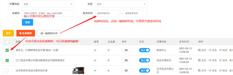 勾選文章,點擊批量刪除可以批量刪除文章;選擇時間后,點擊一鍵刷新時間,可更改文章發布時間;輸入關鍵詞可搜索相關文章。
