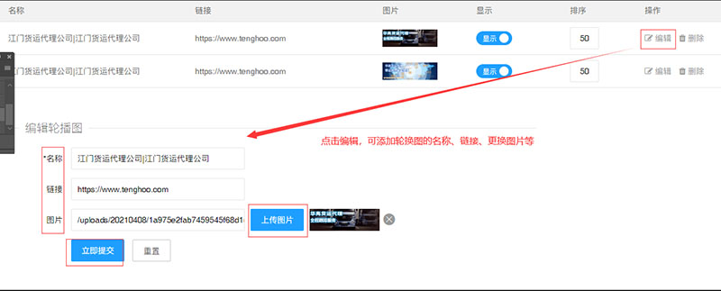 點擊“首頁輪換圖”可添加新的輪換圖。點擊右側“編輯”可添加輪換圖的名稱、鏈接、更換圖片等。點擊“首頁輪換圖”里面的新增可增加輪換圖數量。手機輪換圖同上。(ps.如果更換輪播圖,請前臺鼠標右鍵圖片另存為 下載,這樣可以保證新替換的圖片和原有的圖片尺寸一致,或則按建議尺寸制作圖片)(如下圖)