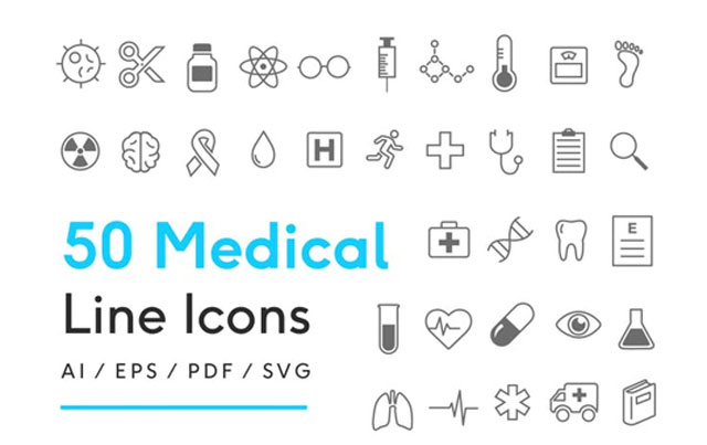 醫學領域就是一個很好的例子。圖中醫學行業線性圖標包括50個完全可編輯的圖標,它們的格式多種多樣。每一張圖片都以簡單明了的方式展示了一個特定行業的概念。還可以看一看更多特定行業的圖標系列: