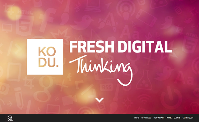 如圖四:KODU.的網頁設計除了漸變的背景圖片以外,還使用了一些炫光效果,亮麗的枚紅主色令網站變得格外清新樂觀。背景上的水印底紋設計也讓頁面不那么單調,并且很好的體現了網站特色。